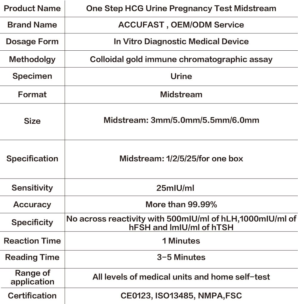 One Step HCG Pregnancy Test is a self-performing immunoassay designed for the qualitative determination of human chorionic gonadotropin (HCG) in urine for early detection of pregnancy.