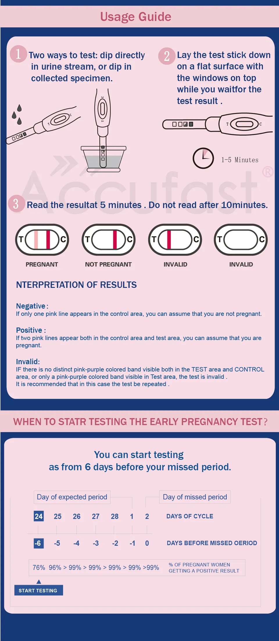 4.Safe packaging and reliable after-sale service - Each pregnancy tests are packaged individually for hygiene and safety. We also offer a lifelong product guarantee for any quality-related issue.
