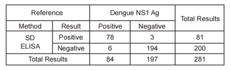 In a comparison of the Dengue NS1 Ag test with SD ELISA, results gave a sensitivity of 96.3% (78/81), a specificity of 97% (194/200) and a total agreement of 96.8% (272/281).