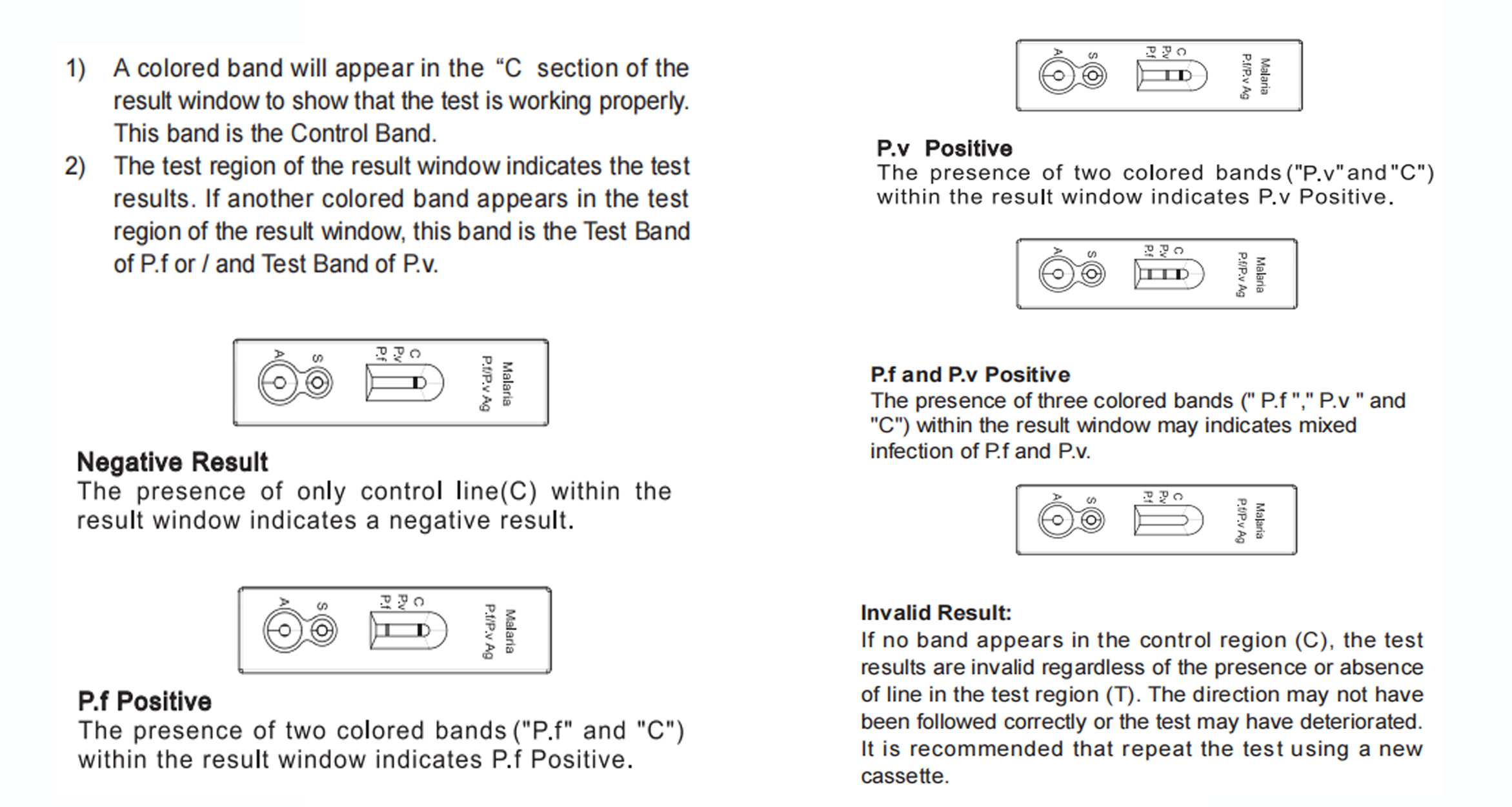 The Malaria P.f/P.v Ag Test is a chromatographic immuno assay (CIA) for the rapid qualitative determinatin of P.f/P.v Ag in whole blood. The membrane is pre-coated with antigen capture antibody on the test region. During testing, the red blood cells are lysed releasing Pf HRP- II and pLDH which are allowed to react with the colloidal gold particles coated with Mal-antibody to form antibody-antigen complex. The complex then moves laterally on the membrane and binds to the antibody immobi lized on the membrane producing a pink line on the test region, which indicates a positive result. The presence of the control line demonstrates the test has been performed correctly regardless the presence of P.f/P.v Ag.