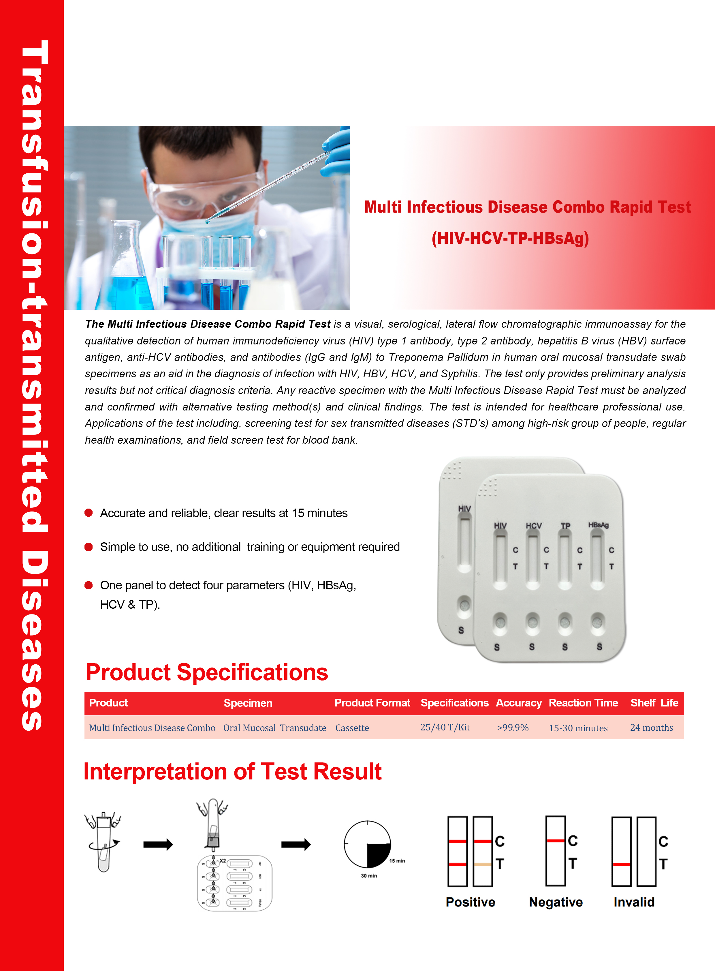 The Multi Infectious Disease Combo Rapid Test is multi-line, serological, lateral flow chromatographic immunoassay for the qualitative detection of human immunodeficiency virus (HIV) type 1 antibody, type 2 antibody, hepatitis B virus (HBV) surface antigen,anti-HCV antibodies, and antibodies (IgG and IgM) to Treponema Pallidum in human whole blood,serum, or plasma specimens to aid in the diagnosis
